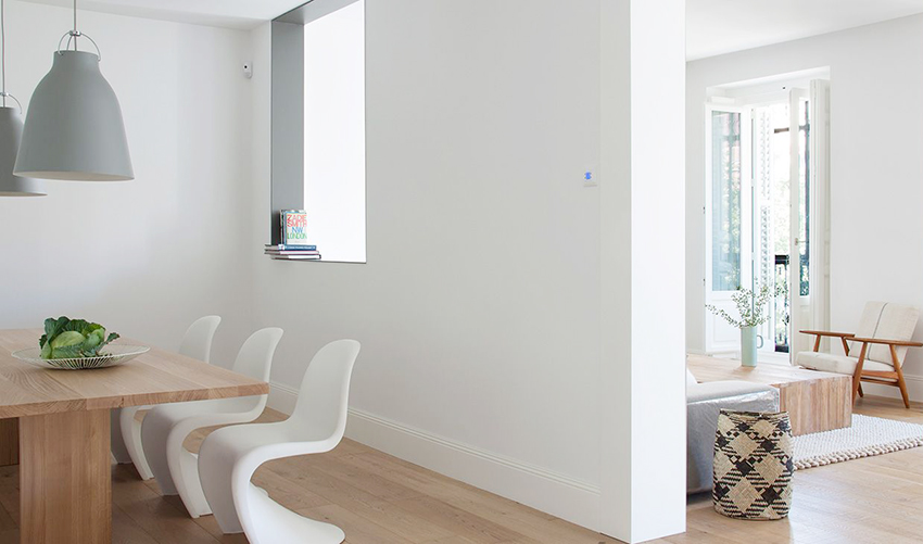 餐厅和客厅有一墙之隔,白色配以木色极具质感,另外椅子造型看起来十分有趣。