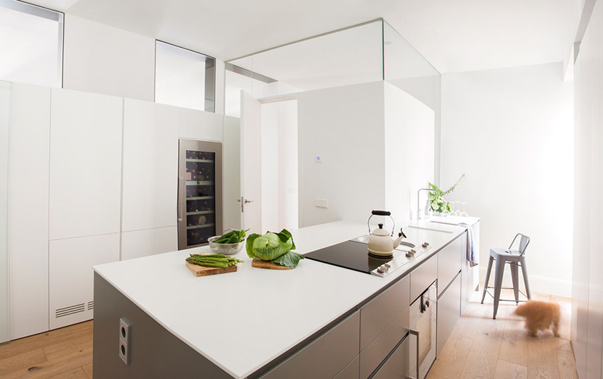 厨房大面积运用白色,没有过多的修饰,给人休闲和放松的感觉,烧一壶茶,拌一份沙拉,制作一份简餐吧。