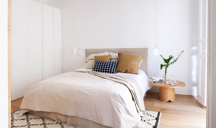 卧室空间十分简约,强调了细节和品质,床头摆放着原木圆桌,床上的枕头颜色与其相近,其中黑白纹样枕头的出现打破了同色系的单一性。