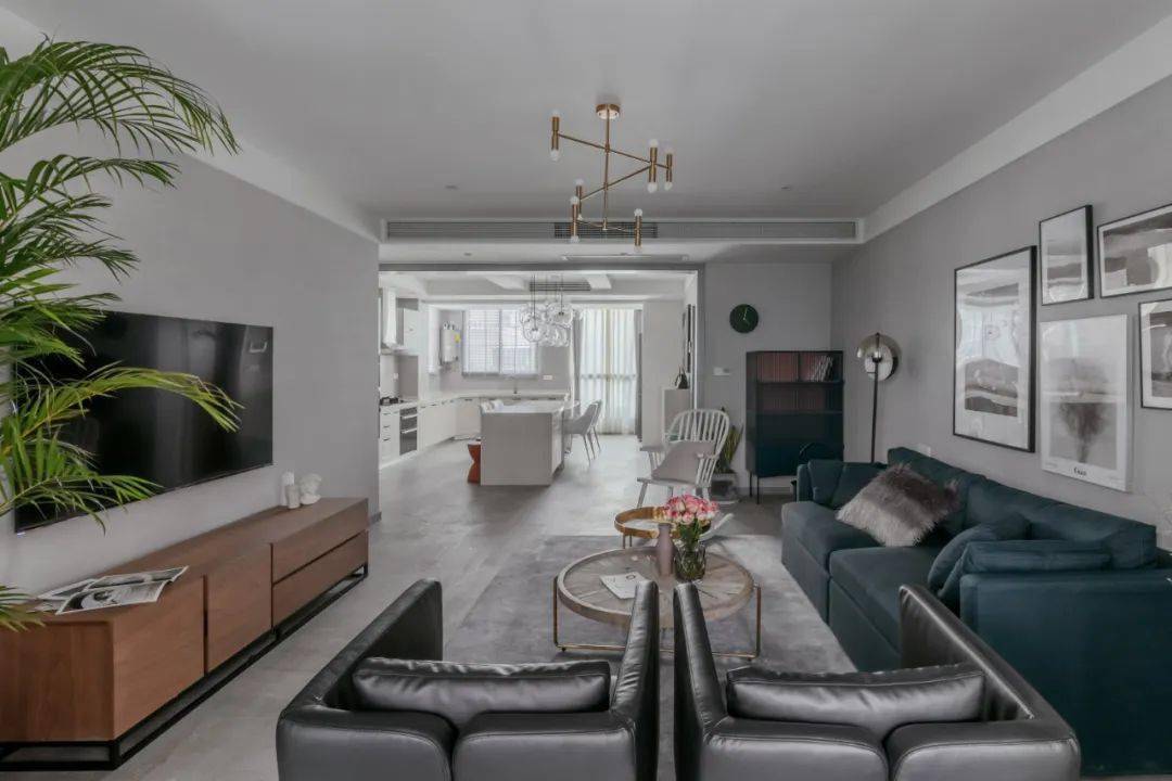 ▲客厅空间整体以简约大方的灰色调为主,布置上成熟轻奢气质的家具,营造出一种端庄大方的低调与轻奢感。在靠窗位置还布置了两张灰色皮质单人沙发,也让客厅空间更加舒适雅致。