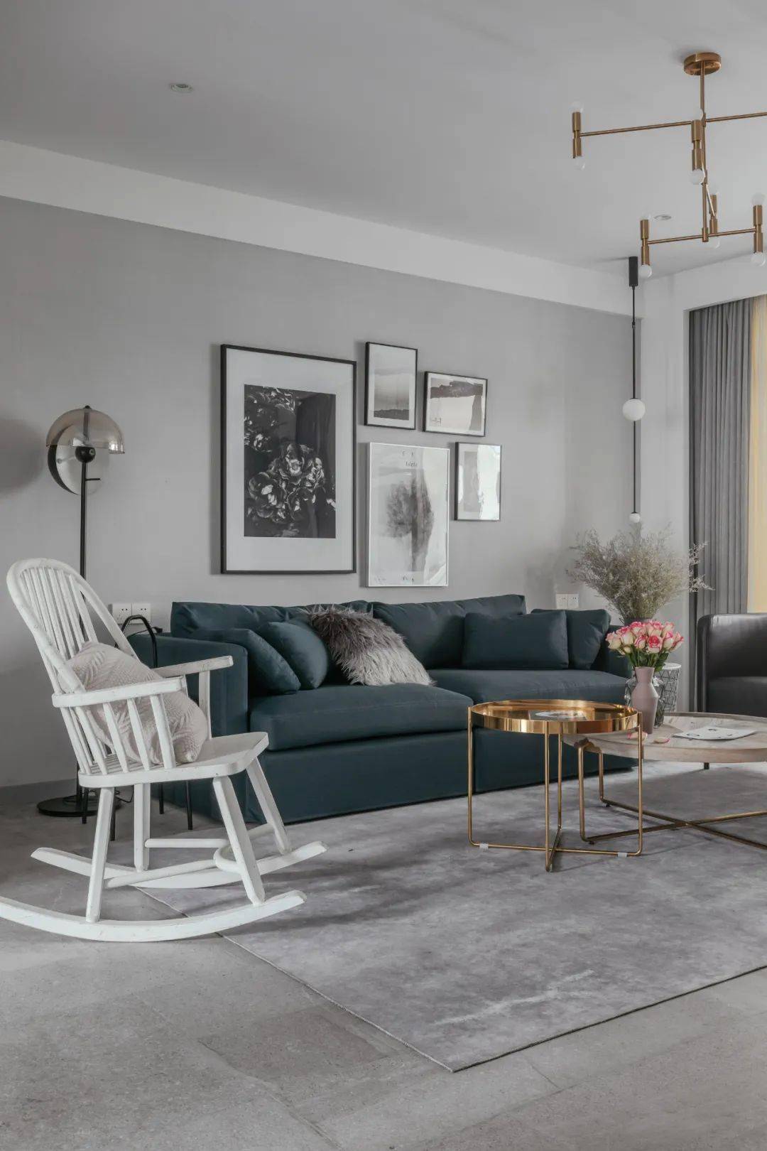 ▲沙发墙挂上一组黑白灰调的装饰画,布置上暗蓝色的布艺沙发,搭配金属+木制的圆茶几,一席灰色地毯,还有白色的小摇椅,让茶几布置上插花花瓶,让生活空间充满简单优雅的舒适气质。