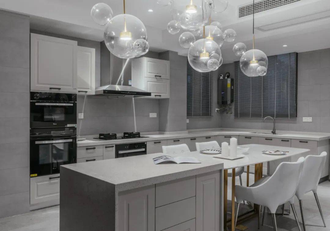 ▲餐厅与厨房以开放式的格局设计,金属架的餐桌以大理石为台面,旁边挨着一个中岛台,上方一连串的泡泡状吊灯,点亮了用餐空间的情趣感。而厨房的操作台围绕着餐桌区域,整体餐桌台面宽松有余,做起饭来也轻松舒适。