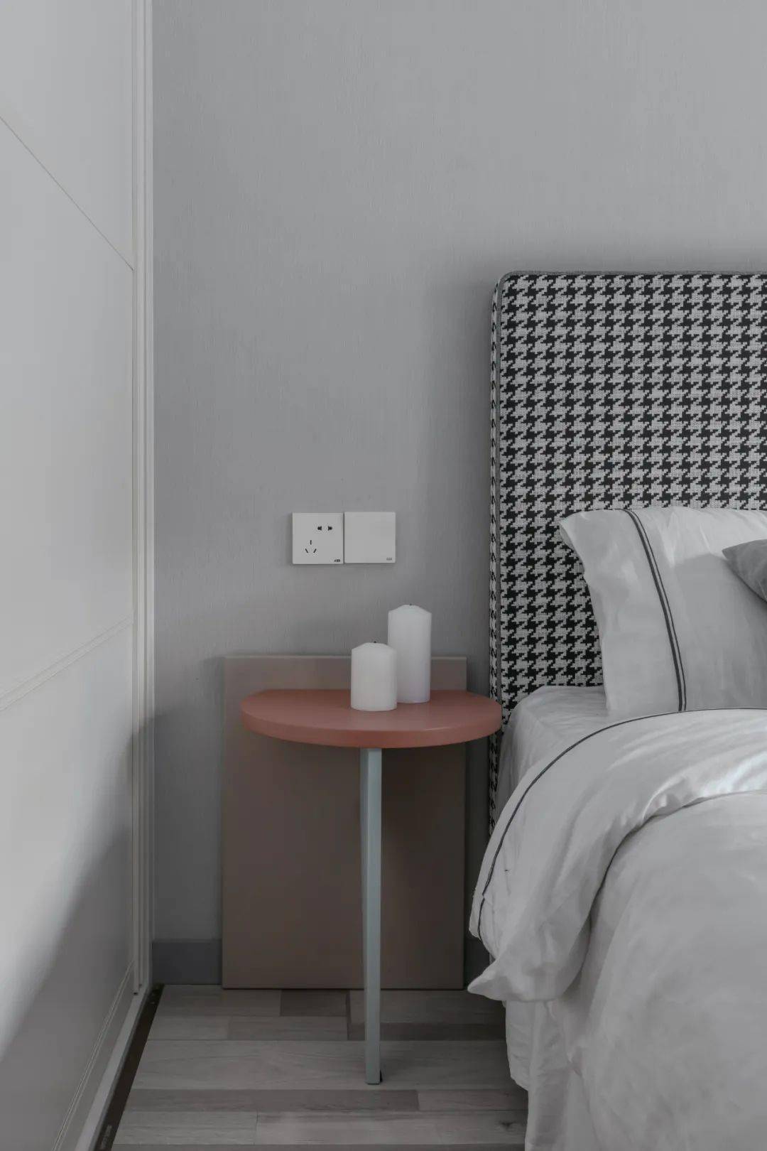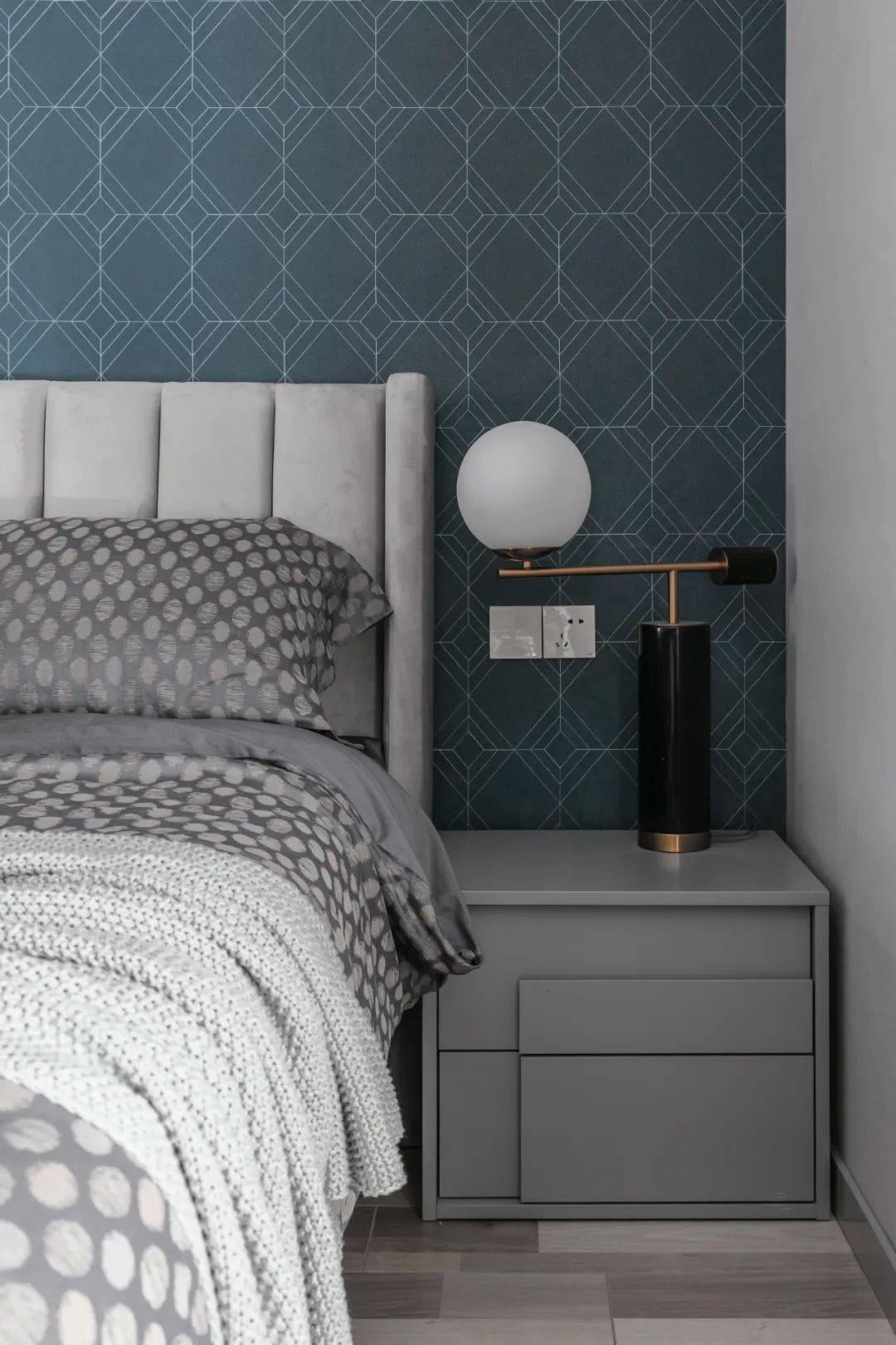 ▲卧室床头墙贴着独特几何线条图案的墙纸,布置灰色布艺床与灰色床头柜,一盏轻奢格调的床头灯,营造出一种简洁优雅的高级卧室氛围。