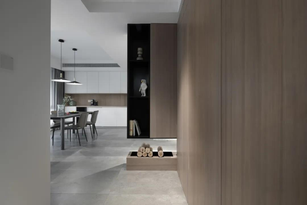 玄关墙面以木饰面进行装饰,正对入户门的柜子,做了悬空的设计,入户形成一定的遮挡,又满足了储物的需求。