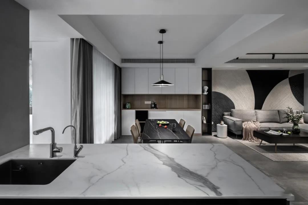 和餐桌一样,台面都选择了岩板的材质,一黑一白,对比呼应。