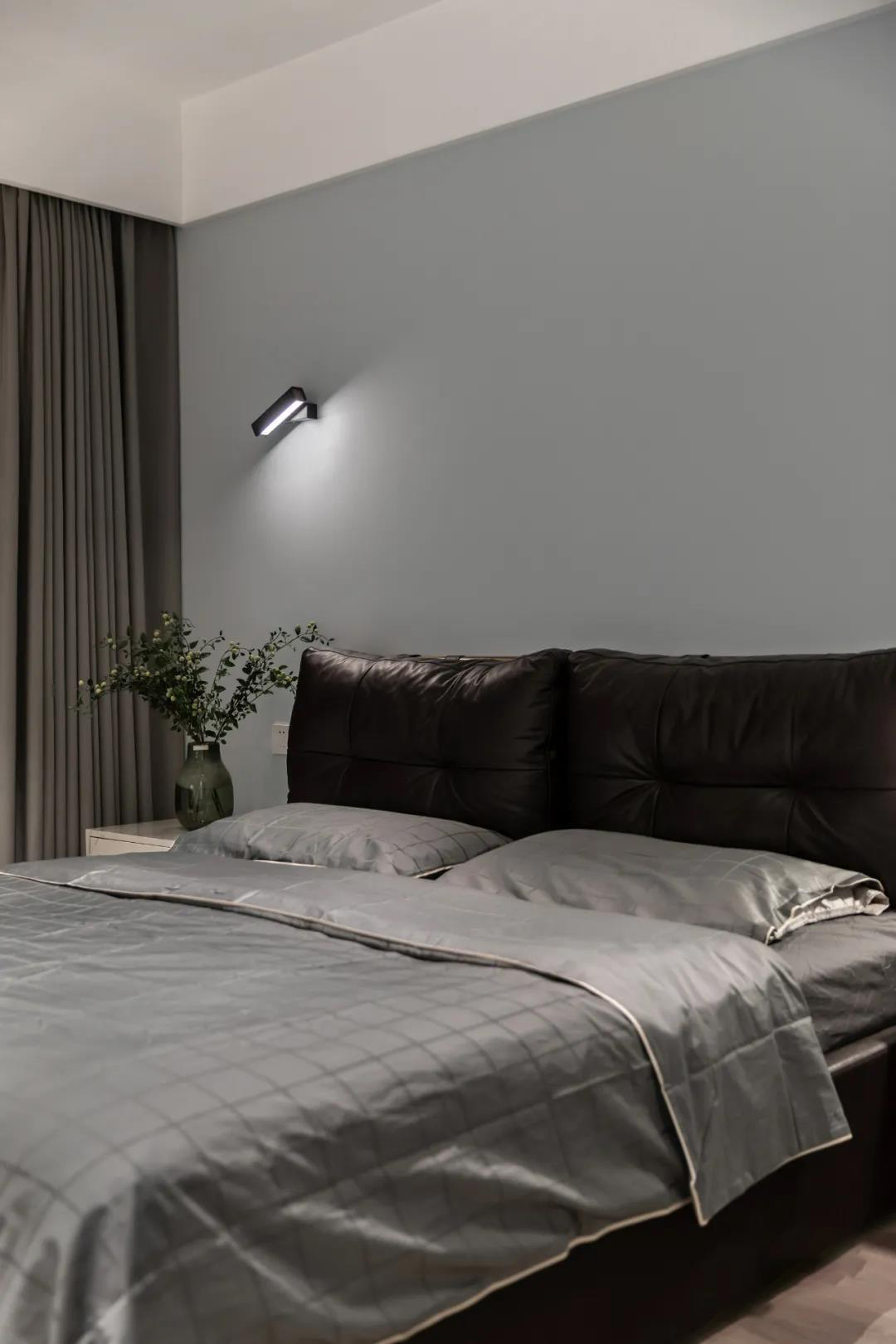 主卧灰蓝色的背景墙和暖棕色的床营造出淡雅舒适的空间情绪,简单有质感。