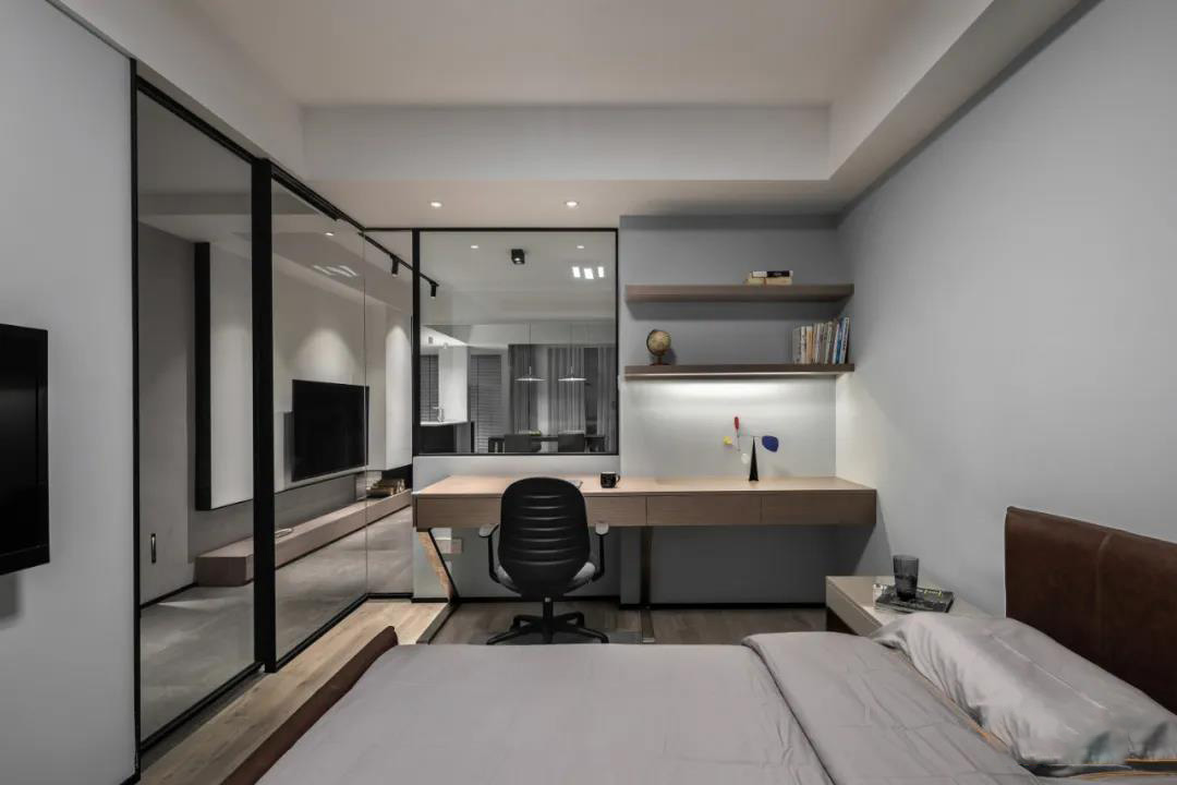 次卧兼书房,半开放式的设计更符合业主的生活习惯。全透明移门是满满的现代感,黑色的线条元素和客厅完美呼应。