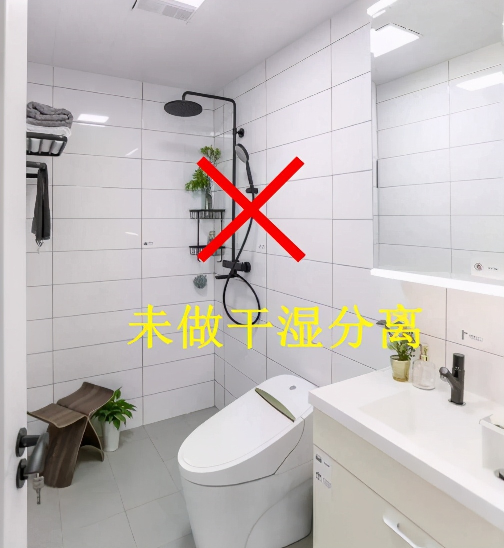 干湿分离很重要,不管空间有多大,都要做干湿分离,不然一到洗澡的时候,水到处乱溅,乱流,空间会显得非常的潮湿,大家也知道,潮湿会加大细菌滋生,所以大家最 好做分离,即便不做淋浴房,也要做浴帘,但不管怎样,下面的挡水条一定要做。