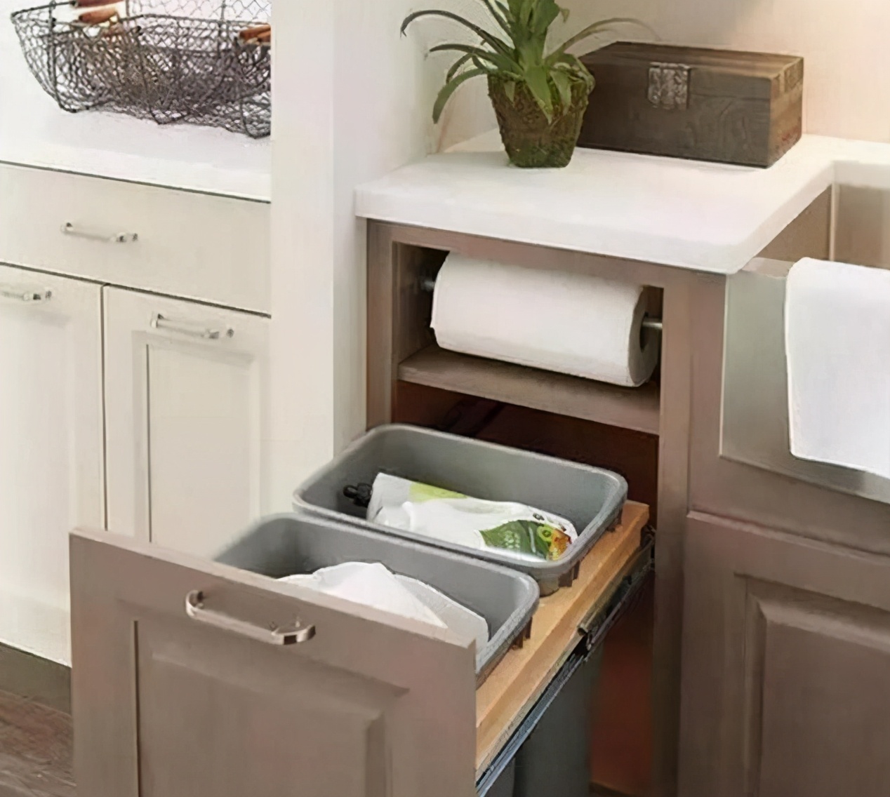 厨房别为了整体效果美观度而去选择做嵌入式垃圾桶设计,这虽然从视觉效果美观,但是时间长真的是太坑了,每次扔垃圾都要开关柜子门,很是麻烦,时间长柜子门板上会很脏,垃圾还容易忘记倒,最后特别容易滋生细菌,发出恶臭味。