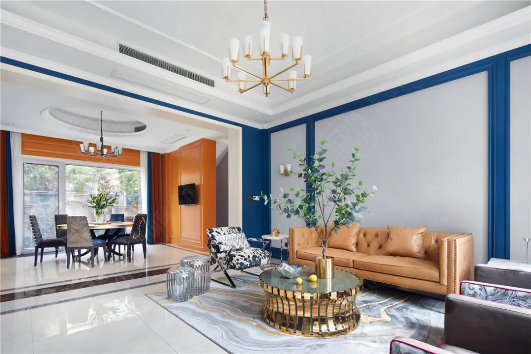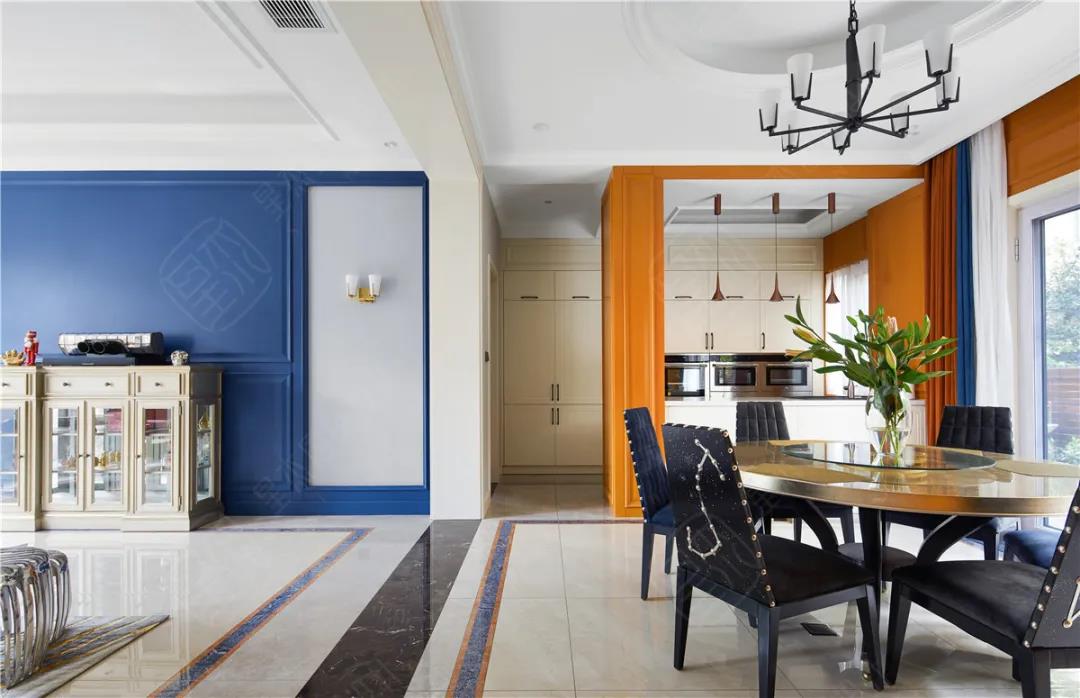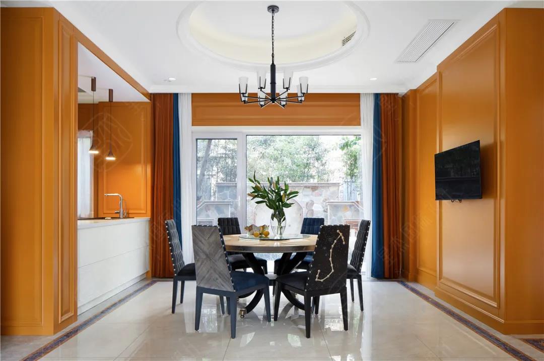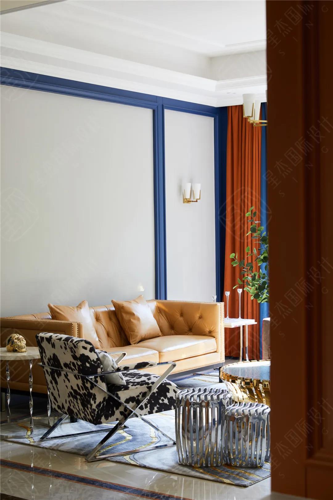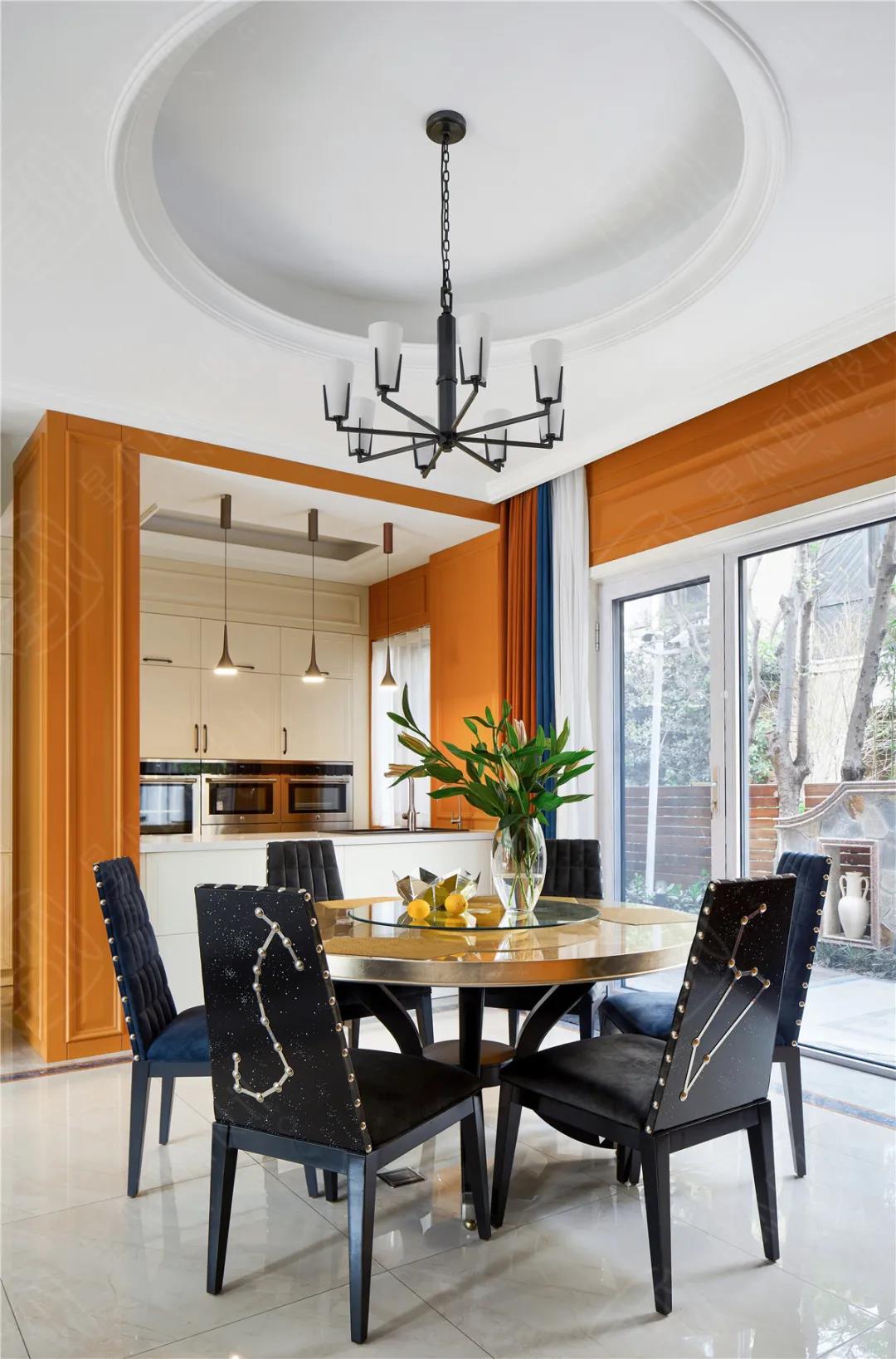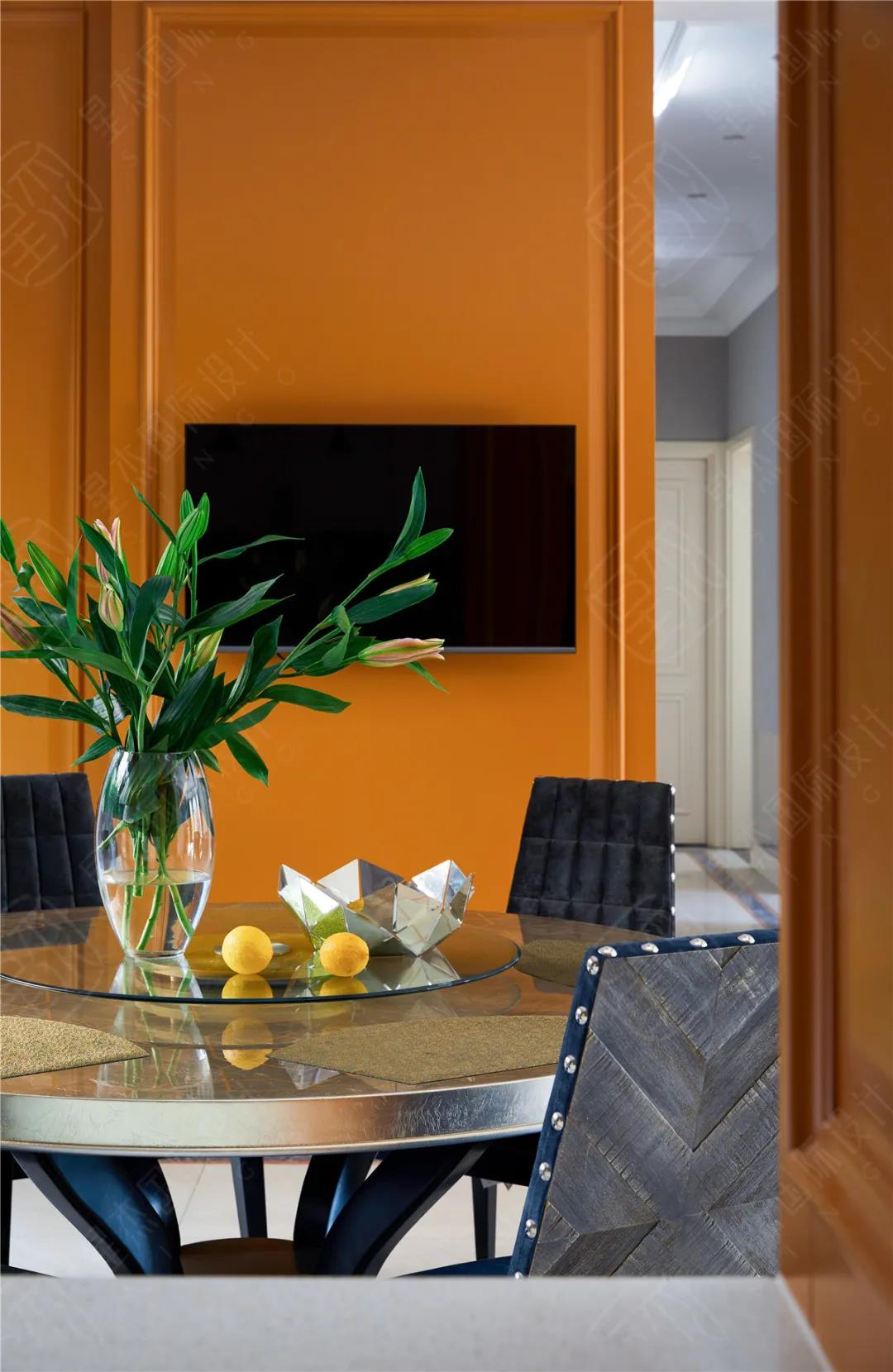 考虑家居的视觉效果,高饱和度的橙色,搭配冷色调的白、墨绿、藏青等中和一下便能显出层次感。