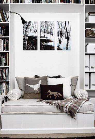 2.看腻了一面墙的书柜,我来教你如何改变它,在书柜的中间设计一个阅读角,就像在图书馆里一样给你增添无数乐趣,舒适的沙发加上柔软的靠垫让你从此爱上读书。