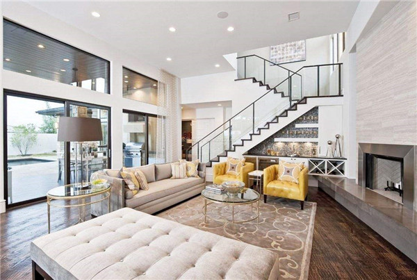 1.倾斜天花板。挑高设计配合倾斜天花板和天窗结构,能够有效引导视线沿着天花板看向天窗外。