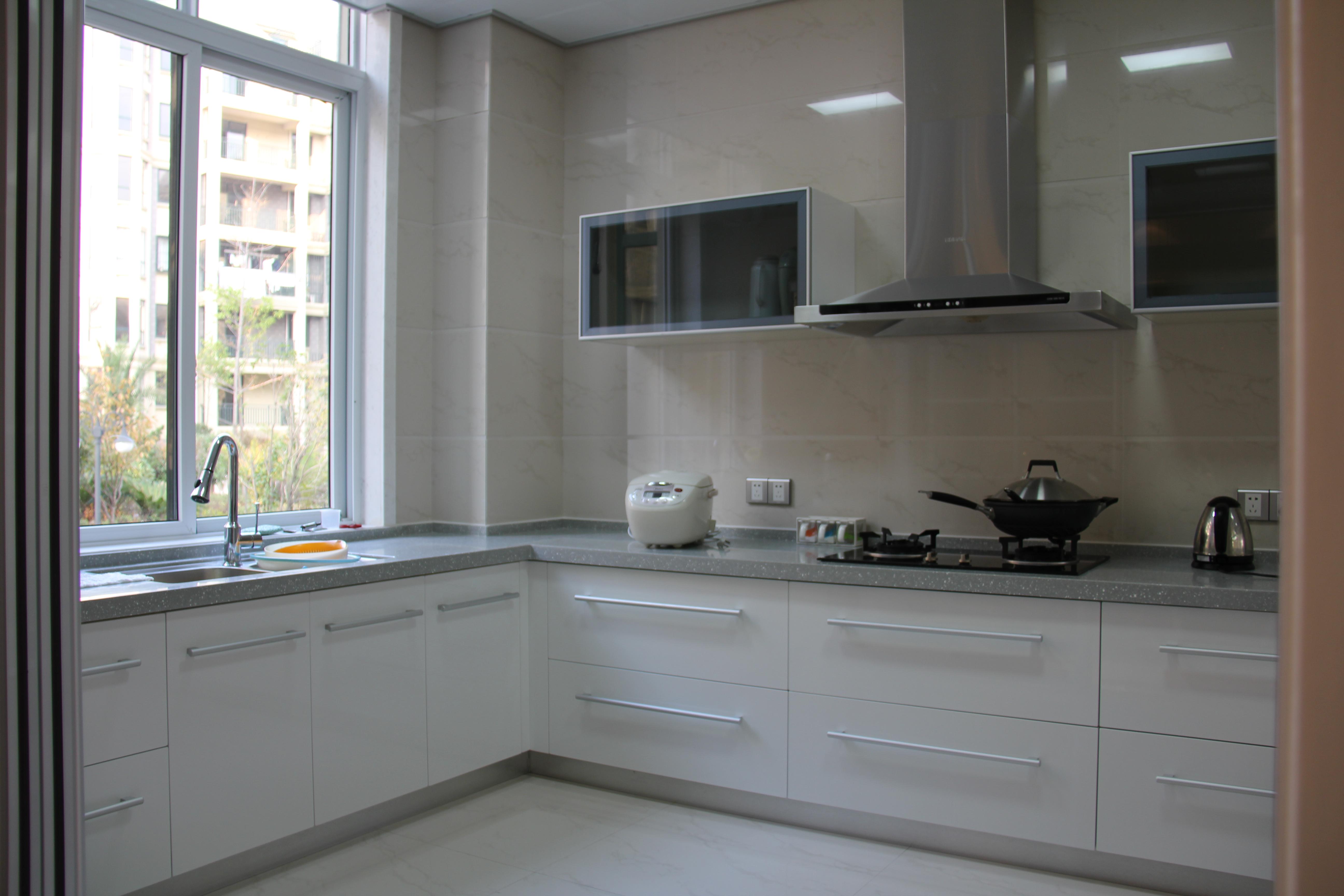 4、充分利用有效空间,吊柜与操作平台之间的间隙,一般可以利用起来,易于放取一些烹饪中间所需的用具,有的还可以作为简易的卷帘门,避免小电器落灰尘。如食品加工机,烤面包机等。