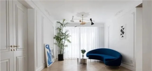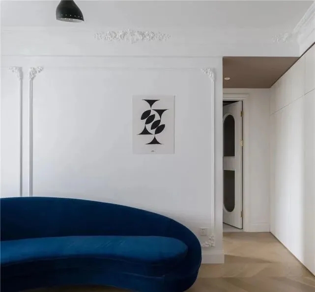 整体以柔和干净的白色为主色调细致雕刻的复古线条搭配时尚知性的蓝色丝绒沙发呈现出优雅而灵动的空间格调