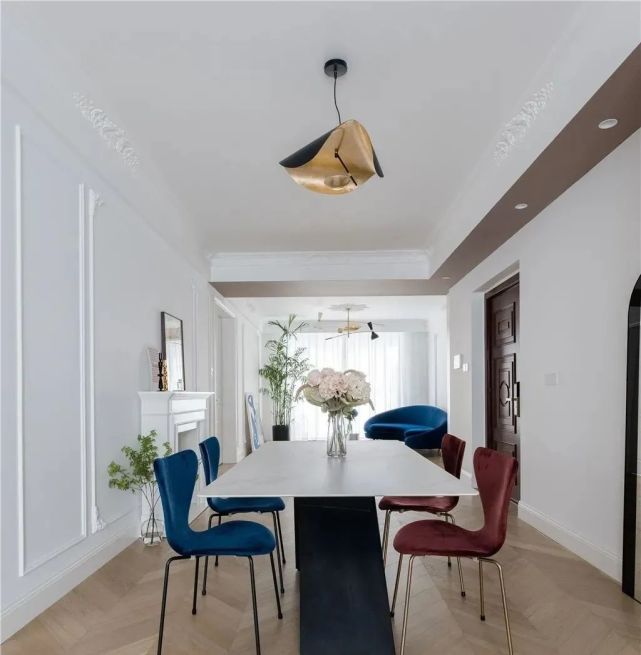 丝绒餐椅古铜吊灯和大理石台面的餐桌都没有繁杂的造型它们融合在一起却有着别样的精致感