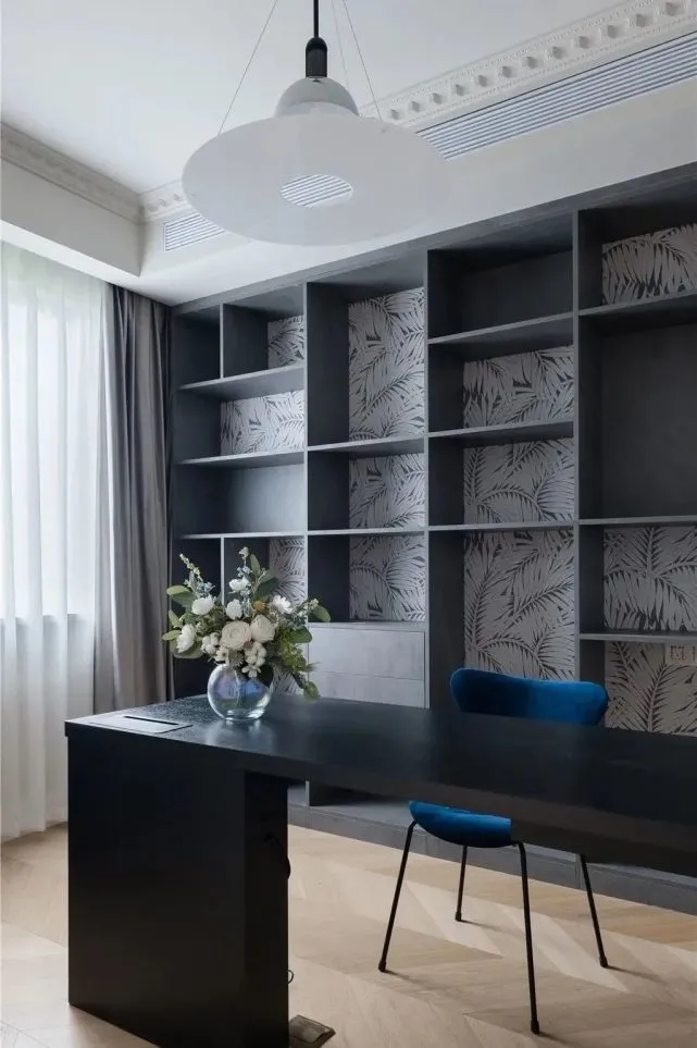 原本普通的定制书柜用壁纸贴饰将让深色书柜跳脱沉闷也增添了装饰性
