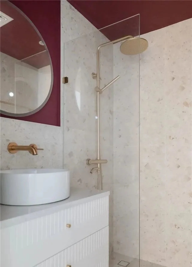 卫浴空间同样是采用莫兰迪配色爵士白瓷砖和防水涂料拼接丰富空间层次