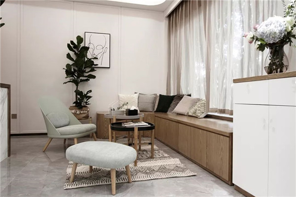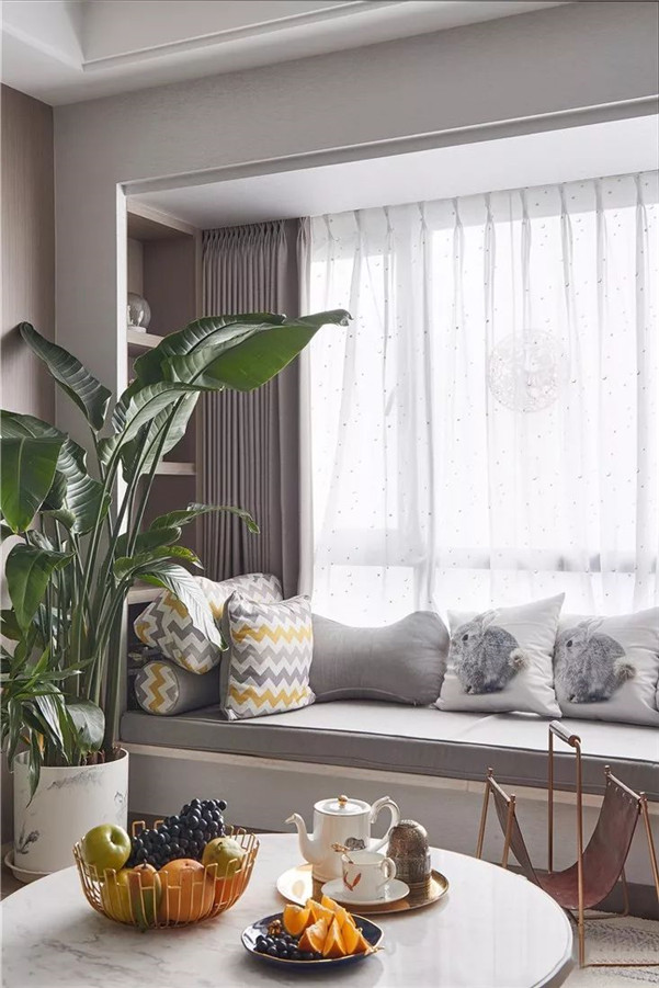 飘窗设计成会客休闲风,同样深受业主的喜爱。有客人来也可以在此落座,喝喝下午茶,聊聊天。