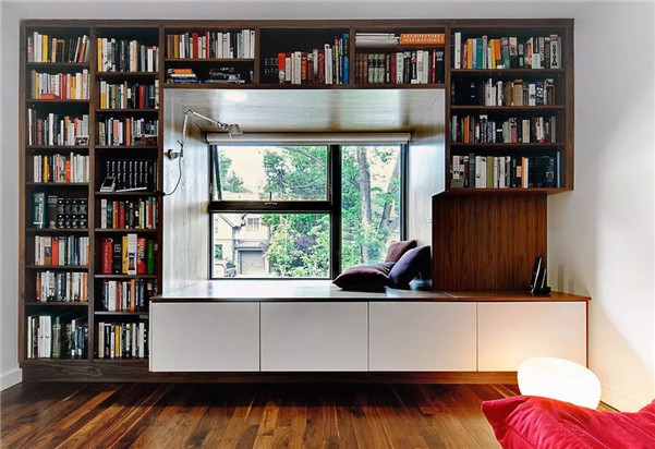 飘窗底部没有墙体,而且面积窄小,硬要保持原有的形状会很浪费的。小编建议在底部设计收纳柜,将家里的小东西收藏起来。