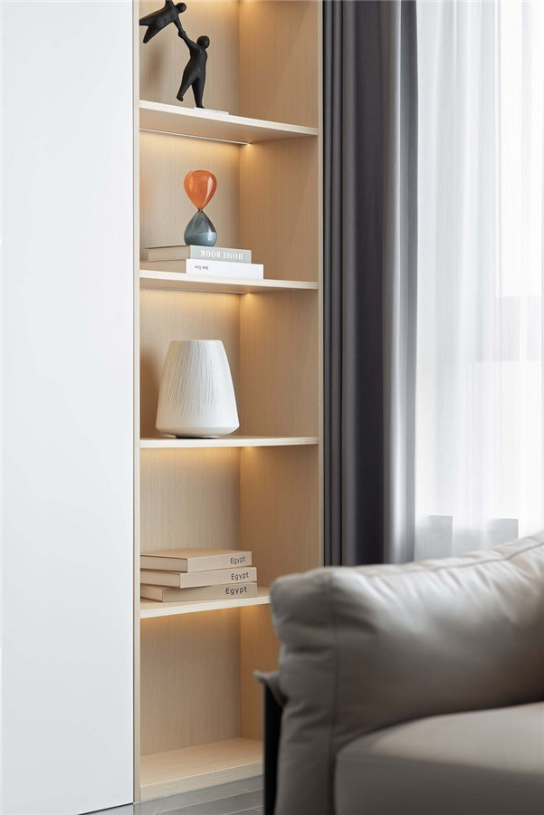 低矮柔和的沙发,搭配质地轻盈的玻璃茶几恰到好处,人居于此,感受着被屋宇庇护的安稳宁静,就想在沙发上小憩,或是席地而坐,生活的美好,如同饱满的阳光一样穿透进来。