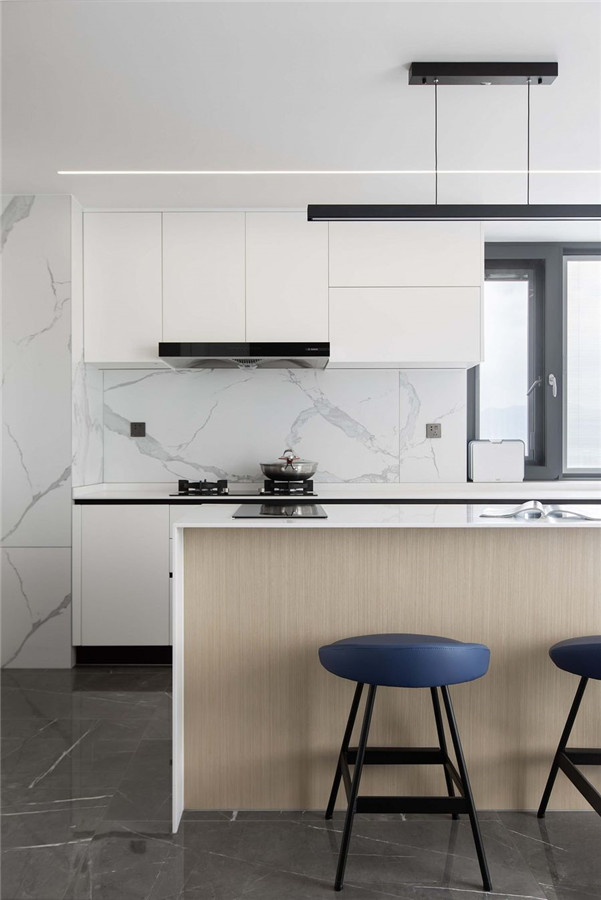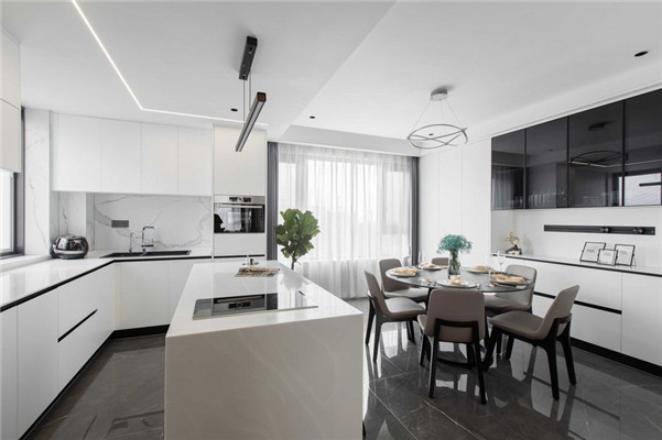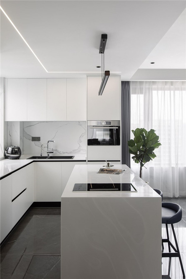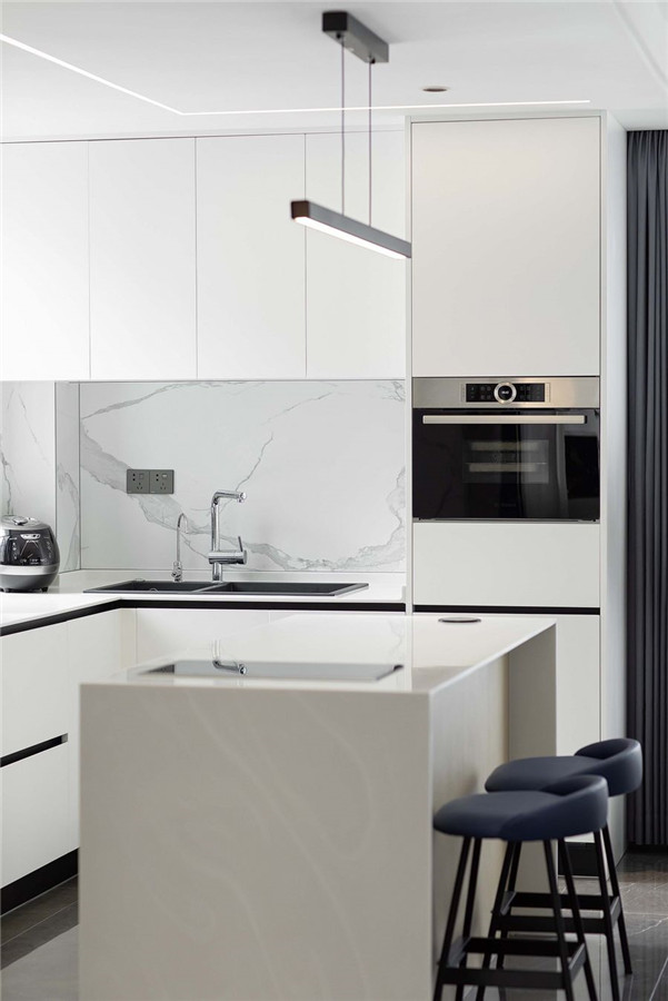 以白色为主的色调,让厨房和餐厅相互呼应,考虑到日常使用的便捷舒适,设置了回字形动线,即便多人共处室内,行动上也不会产生妨碍。开放式厨房为空间添上一丝烟火气息,生活因此鲜活起来。