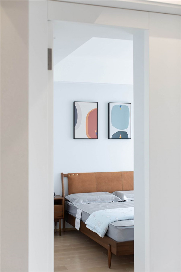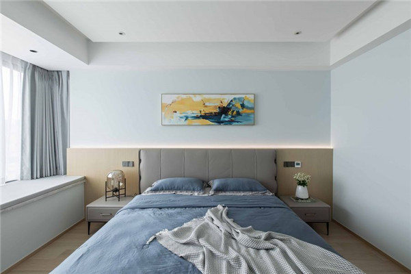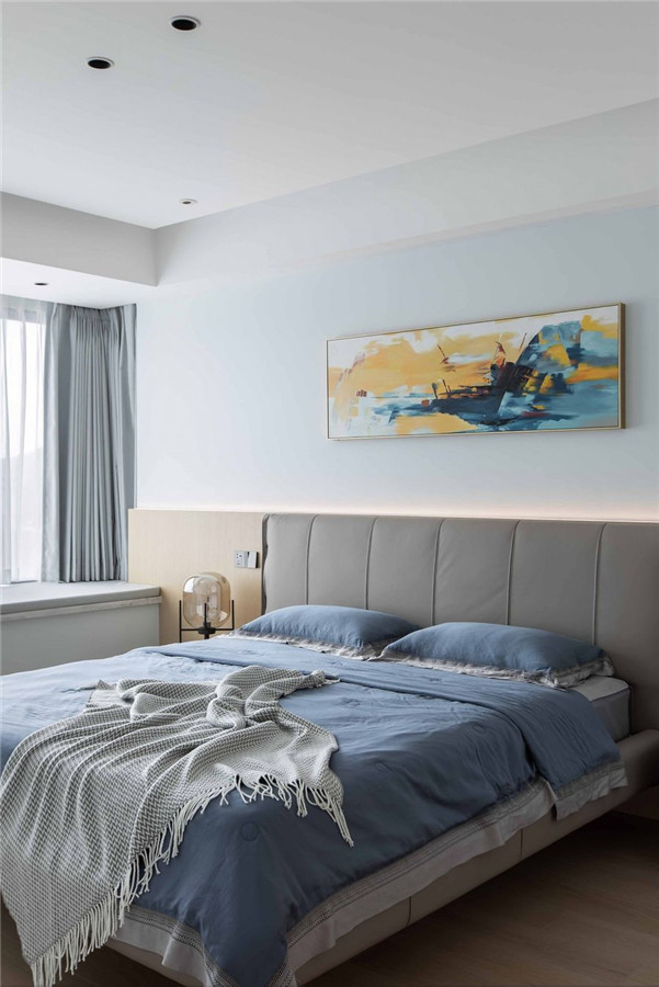 主卧床头以浅黄色的木饰面作为背景装饰,配以轻暖光泽感的金属灯具,折射出宜人的温度。沉稳自然的深色床品,辅以降低了饱和度的蓝色系艺术漆,如微风吹过的海面。当阳光透过落地玻璃窗洒进室内,与空间自然融合成一幅“岁月静好”的画面。