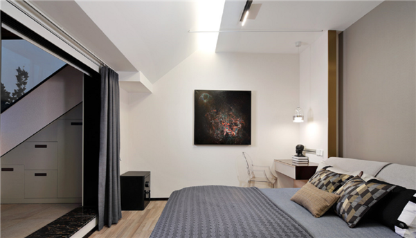 卧室空间中,淡淡的直线条,使得空间呈现出纵深感,灰白墙面交替更迭,产生了特殊的韵律感和节奏感,形成了某种内在的呼应互动。