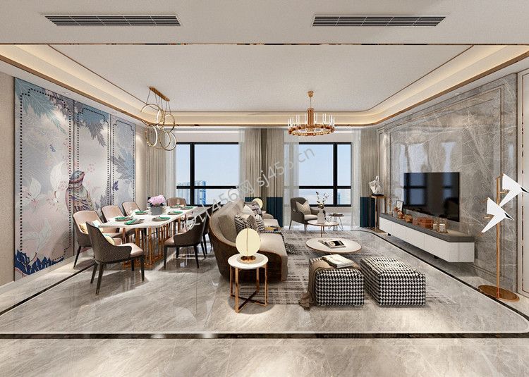 轻奢风格160平米三居室客厅餐厅一体装修效果图