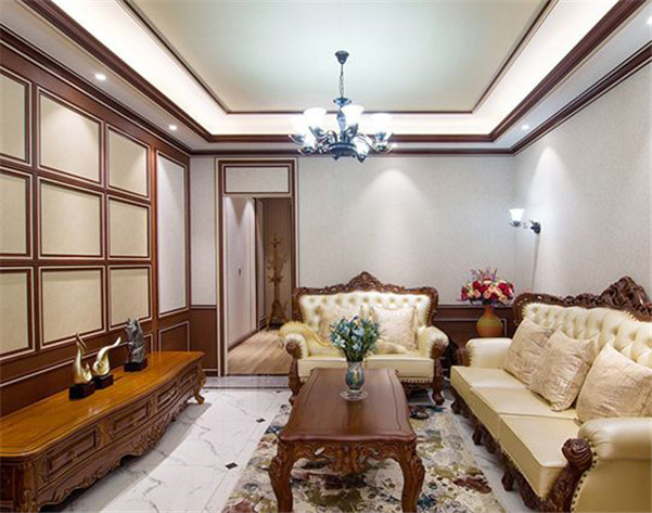 ※简洁干练的空间搭配欧式雕刻家居,再配上热情奔放的花卉地毯,延续欧式客厅豪华的风格。