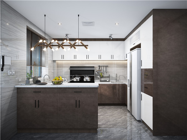 开放式的厨房设计,仿石材纹理的墙地砖自带奢华,嵌入式冰箱,与橱柜相连接的吧台,实用而有趣。