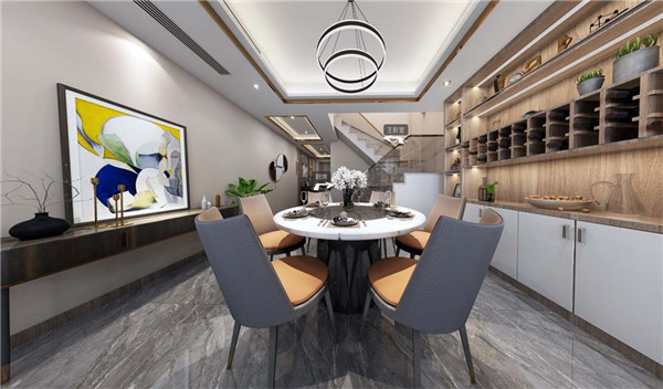 餐厅设计上采用圆桌,拉近了家人之间的距离,左边做了一个装饰柜,与右边的餐边柜遥相呼应,达到空间的平衡,颜色跳跃抽象艺术画点亮了整个空间。
