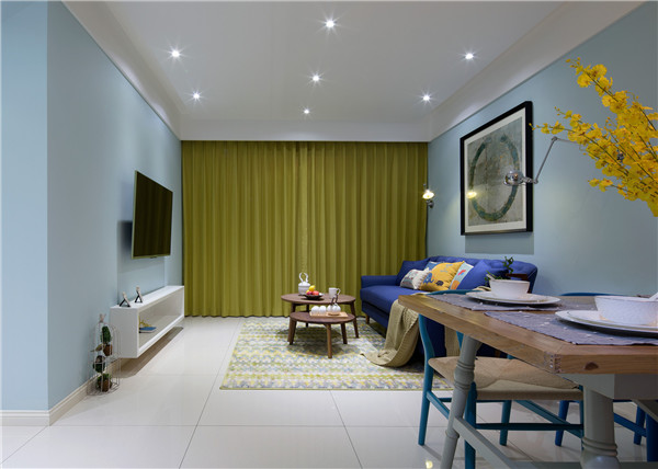 墙壁粉刷的浅浅淡蓝色,宁静优雅,电视墙没有任何糅杂的修饰,褐绿色的落地窗帘,明朗而又温馨。