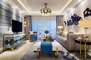 案例说明:后期软装方面,选用的配搭灯具、家具等也很考究,既有西式元素,又具有强烈的时代感元素。配搭上欧式家具、水晶灯、车【青岛百家装饰】现代三居室装修案例 时尚又雅致