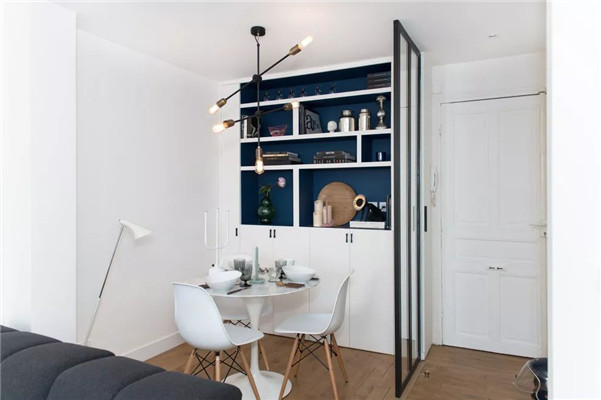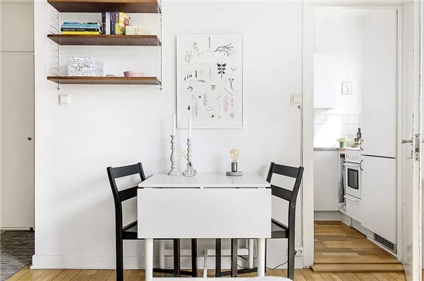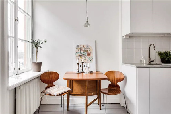 还有一种餐桌也很适合小户型,那就是可收纳的餐桌,这种餐桌平时看起来就和柜子差不多大,放在角落或靠墙的位置,占空间很少。需要用的时候,就展开餐桌椅即可,方便好用。