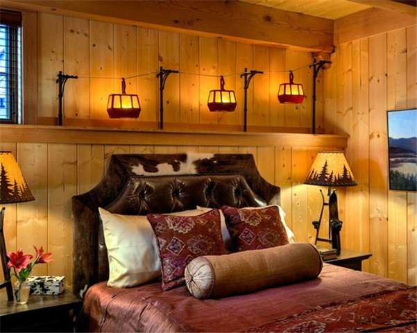 木板背景墙本来就给人一种古朴的自然风情,铁艺立杆并列向上的伞个小车灯,有着悬浮的轻盈感,在古朴自然的房间里别样的雅致。