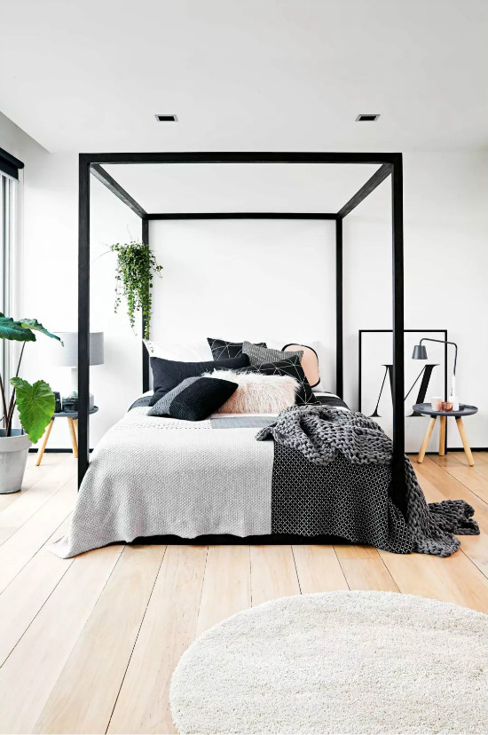 如果是空间面积允许的情况下,千万别错过今年大热的天蓬床,它赋予空间如同艺术装置般的框架感,再搭配上纱幔等小装饰,能增加浪漫的度假气息。