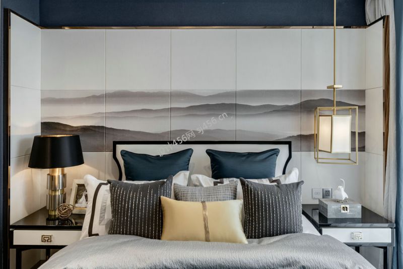 新中式风126平米三居室卧室背景墙装修设计效果图