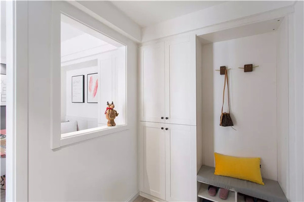 入户玄关,靠墙是鞋柜+换鞋凳+挂衣区的一体化设计,非常实用。和餐厅之间通过窗洞进行隔断,缓解了开门见厅风水上的尴尬。