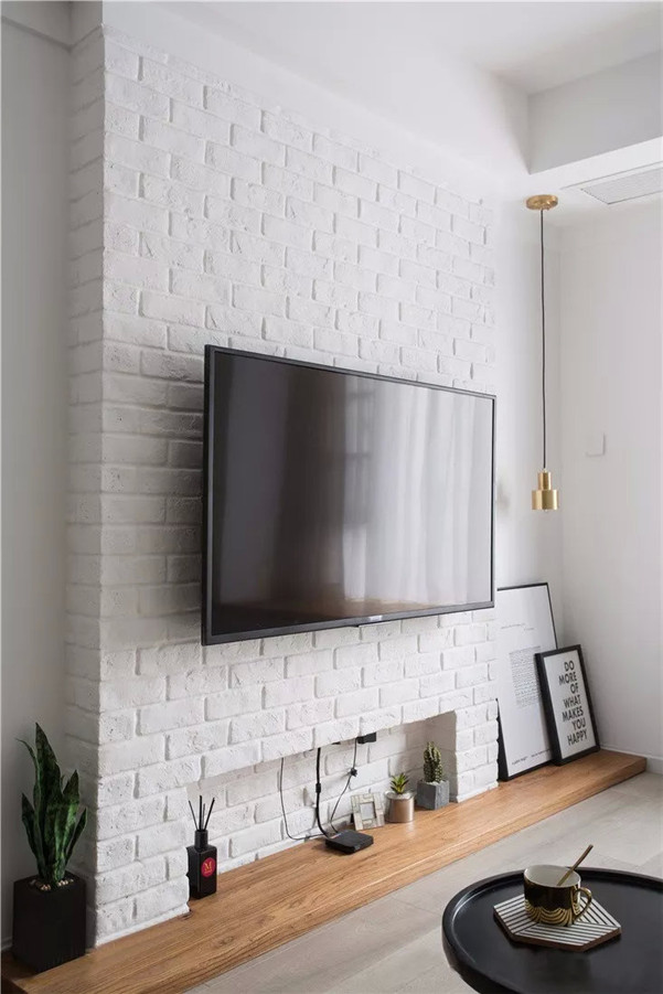 电视背景墙做了一个凸出的造型,有点类似壁炉的设计,很有时尚感。小绿植,装饰画,精致的吊灯,都让这个角落变得十分有品位。