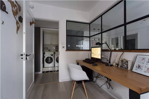 浅灰色的沙发一看就特别的柔软舒适,各式各样的抱枕搭配得可真好。和书房之间用玻璃窗做隔断,可以更好地保证空间的通透性。