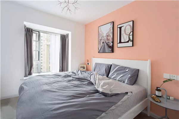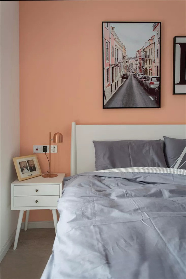 很喜欢主卧的背景墙配色,淡淡的珊瑚橘,真的超级漂亮。双人床选择了非常舒适的灰色床品进行搭配,也很时尚呢。
