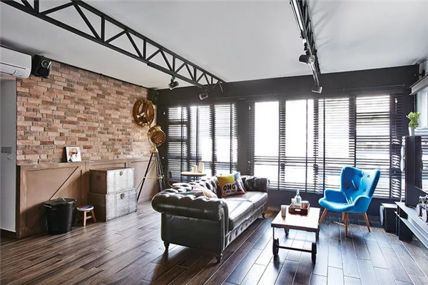 多运用工业材料,如金属、砖头、水泥墙等,适当的暴露原建筑结构或管道,墙面带有凹凸痕迹。