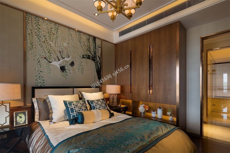 新中式风格235平别墅卧室背景墙装修设计效果图