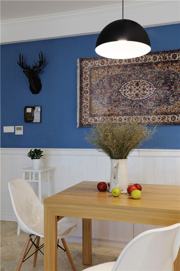 加上花纹布艺挂在墙上十分异域,将蓝与白不同程度的对比与组合发挥到好处。