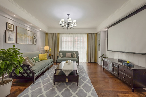 [青岛金苹果装饰]100平米美式风格设计,超喜欢客厅投影仪!