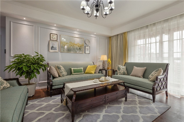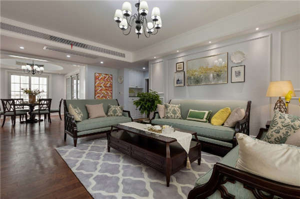 选用浅绿色布艺沙发配上碎花靠枕加以点缀,加上棕色木质茶几,地面铺设一张灰白格地毯,对称的石膏线背景墙,以及艺术壁画,将整个美式氛围营造得无比浓厚。