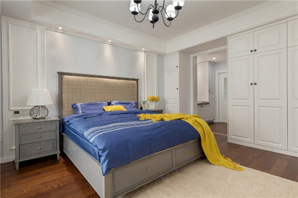主卧,咖色软包床头搭配蓝色系床品,右侧黄色插点缀床头柜,一盏简单而又别具风味的顶面吊灯让空间又多了几分灵动,整个空间给人舒适静谧之感。