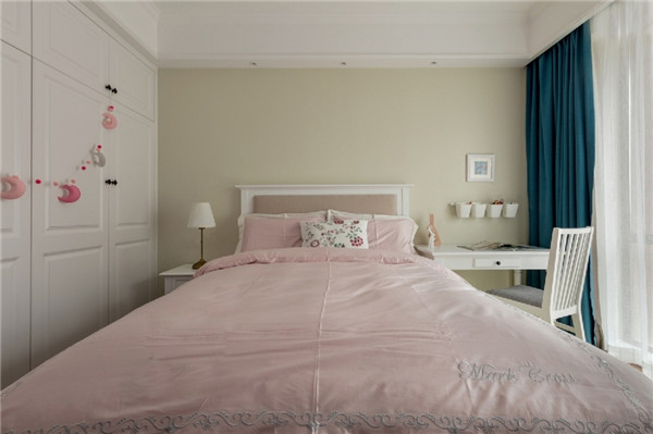次卧,米色背景墙与粉色床品相搭配,满满少女感,床边摆放一套书桌椅代替了右侧的床头柜,可作梳妆台、工作台使用。