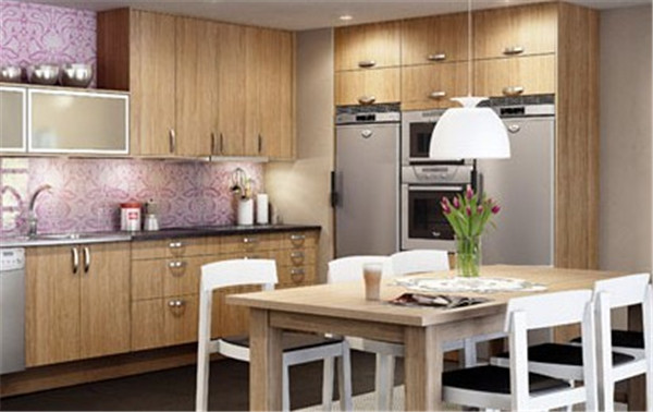 搭配点评:紫色一向被认为最为神秘性感,最 具女人味,花样的紫色壁纸让厨房色彩更为饱满、感觉更加温馨。