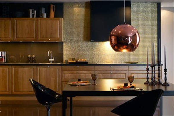 原木色橱柜+金色亮面瓷砖+艺术灯具